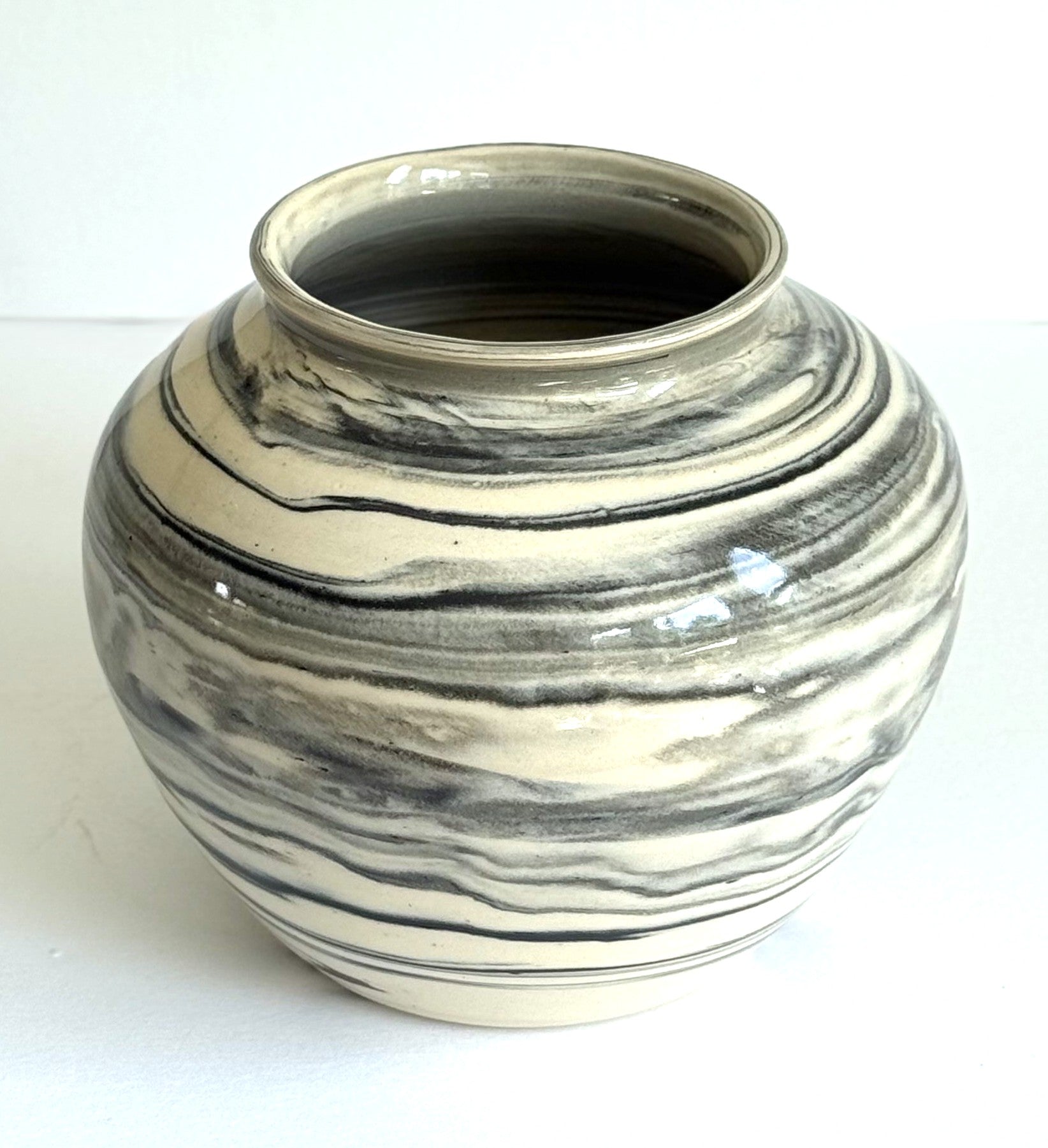 Stunning example of layering, stacking and slicing colored and white clay. The colors are in the clay, not just on the surface. Clear glaze goes on top. I love the unpredictability of this technique. You never know exactly what it will become. Each piece is one-of-a-kind.